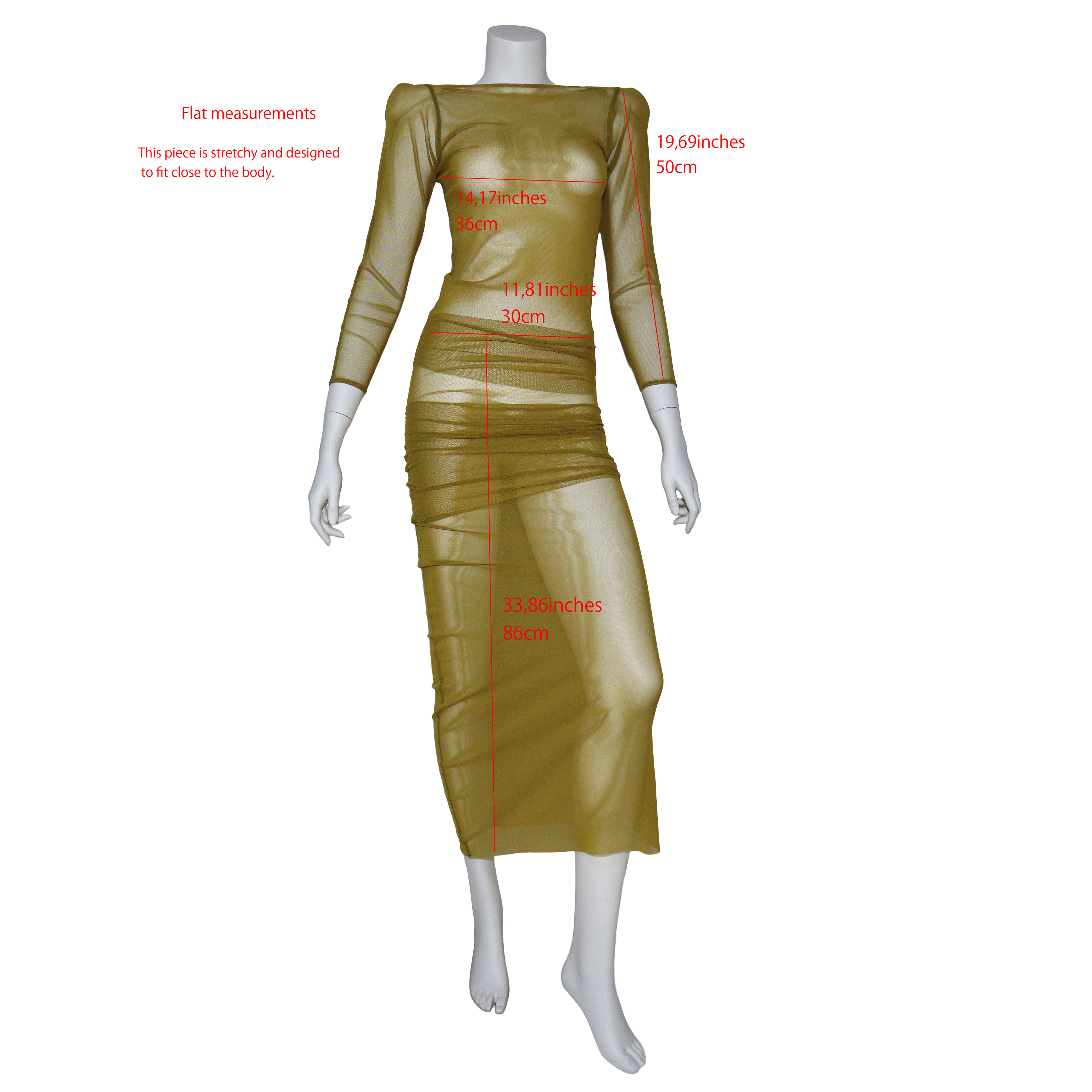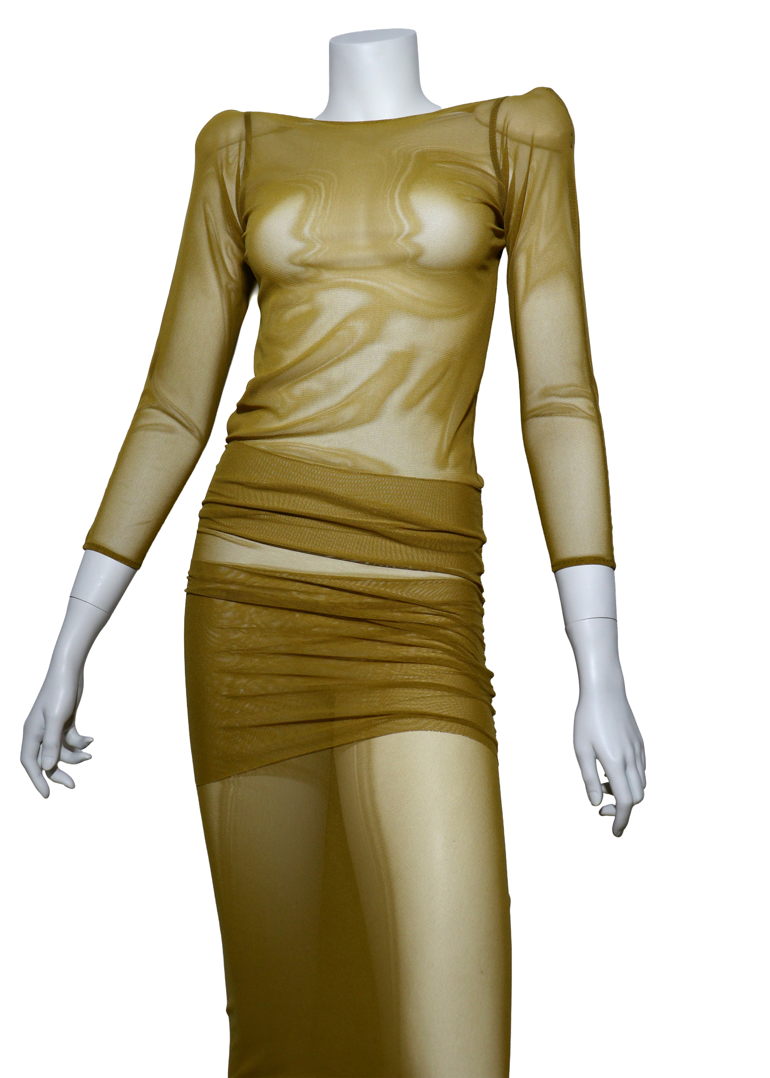 A layered dress piece constructed from power net, designed to trace the contours of the body through sheer transparency, creating a silhouette that balances tension and sensuality.